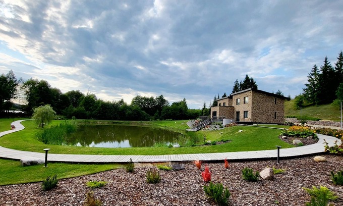 Escape to Sabos Rezidencija, a luxury vacation rental in Lithuania, offering a private countryside getaway with a serene pond, breathtaking sunsets, and lush greenery. This modern holiday home combines style, comfort, and nature, making it perfect for family vacations, group getaways, weddings, and special events.
