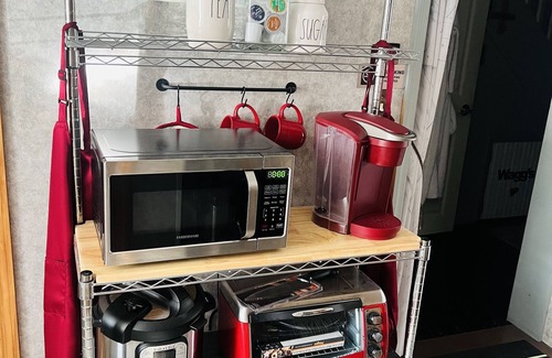 kitchenette fully stocked w/ supplies , Keurig coffee maker , no stove on this property , electric teapot , crockpot ,, microwave, & insta pot, toaster oven & a toaster ,lwaffel maker, including a, bowl of free snacks & we