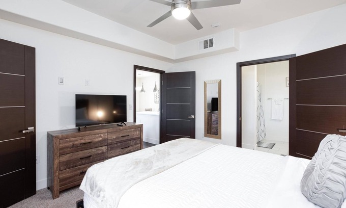 The primary bedroom features an en-suite bathroom with bath tub/shower combo with wide rain shower head, and walk-in closet. There is also blackout curtains that allows you to have a very relaxing beauty sleep, especially if you work at night.