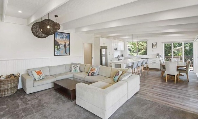 Family friendly open plan living incorporating a modern kitchen designed for entertaining. Comprising extensive stone bench tops, breakfast bar seating, electric cooking, dishwasher, microwave, coffee machine and dining table. The super cozy living room features a spacious lounge, split system heating and cooling, an open log fire, and ducted heating throughout the home. Please note if you are wishing to use the fire place you will be required to bring your own wood.