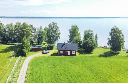 The cabin is located on a spacious, sunny lot, surrounded by fields. At this cabin, you can enjoy peace and privacy, with the nearest neighbor approximately 100 meters away. The grassy yard offers a spectacular view of the large expanse of Lake Lappajärvi. The cabin's own beach has a shallow sandy bottom that deepens quickly. There is a wooden pier (7,6 meters long) and a private rowing boat.