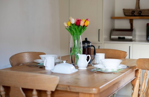 Stepping through the front stable door into the kitchen you can take off your boots at the wooden bench before popping the kettle on for a cup of tea out in the sunny and secluded garden. The kitchen has a wooden dining table where you can enjoy romantic home cooked meals together when you're not wining and dining at one of the local inns. In the cosy living room curl up on the plump sofa under the wooden beams and relax to the crackling fire in the wood burner. The shuttered windows look out over the quiet lane, used more by walkers than cars.