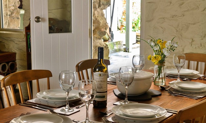 The front door from the street opens into a sizeable hallway with coat hooks, a chair and shoe and boot storage. To the right is both a kitchen, breakfast room and a gorgeous lounge diner. Original features of the historic property are present throughout. The cream coloured units in the kitchen are stylish with a white stone effect worktop and include a built in eye level oven and grill, gas hob, dishwasher and free standing fridge freezer. A small breakfast table with two seats is positioned at the other end of the room in a bright spot next to the window. Heading through into the lounge diner, this stunning room also shows off the property's historical features with a beautiful inglenook fireplace built into the stone wall to one end. A log burner is located within the fireplace on a slate hearth surrounded by brass accessories and string lights. Two armchairs are positioned around the fireplace, and opposite, a six seater traditional farmhouse dining table is the perfect spot for social evenings in. There is also a useful utility room with a washing machine, dryer, games, and a working area.