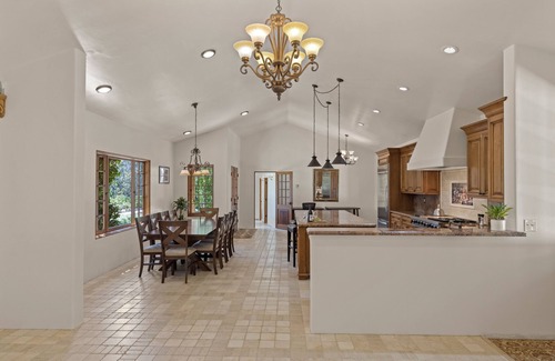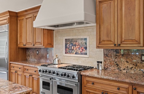 Spend your evenings around a gas fire pit, laughing with your loved ones and enjoying a delicious meal off the grill. The single-level home opens onto the back patio and gardens through multiple access points. So, after you’ve finished dining, pass back through a bougainvillea tunnel and French doors into the heart of the home: an exquisite, open concept kitchen with creamy granite countertops, warm wood cabinetry, and a Viking double oven with a six-burner range.