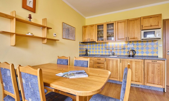 "Horní Mísečky", 1-room apartment 35 m2, on the ground floor. Comfortable and cosy furnishings: living/sleeping room with 1 double sofabed, 1 double bed, dining table, satellite TV and international TV channels. Exit to the balcony. Open kitchen (dishwasher, 2 ceramic glass hob hotplates, toaster, kettle, microwave, electric coffee machine, Capsules for coffee machine (Nespresso) extra). Shower/WC. Electric heating. Balcony. Facilities: Internet (WiFi, free). Parking (roofed). Please note: suitable for families. Non-smokers only.