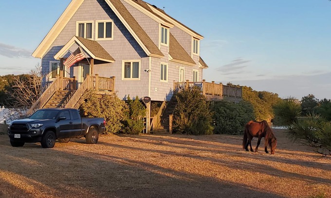 Horse Haven is a four bedroom two bath canal/water front home on a large private (1+acre) lot in the Wild Horse Estates section of Carova (4x4 accessible only). The famous Corolla wild horses roam freely in this section of North Carolina's Outer Banks barrier island - and they love the large private yard of Horse Haven. Horse Haven features; large private lot (w/ limited access private road and only one direct neighbor), canal/water front (w/ bulkhead and dock), adjacent to natural area, private swimming pool & hot tub, decks to lounge/relax (w/ views of horses/nature, canal/water, sunrises and beautiful sunsets). Horse Haven is walkable to beach, but more convenient to load beach gear and bodies into your 4x4 vehicle for quick drive to and park on beach (w/ beach parking pass provided).