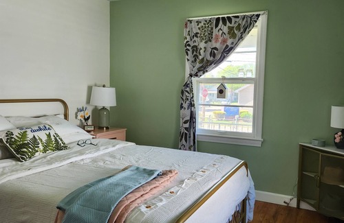 The main floor includes a cozy Living Room, staple-stocked Kitchen, Full Bath, and two Queen Bedrooms. There are outdoor spaces in front and back if you want to sit and enjoy the neighborhood. Upstairs, there is a King Bedroom with an electric fireplace, a work area, and a sitting room to complete the suite. If needed, the couch in that room is a Queen sleeper sofa that can be used by extra guests.