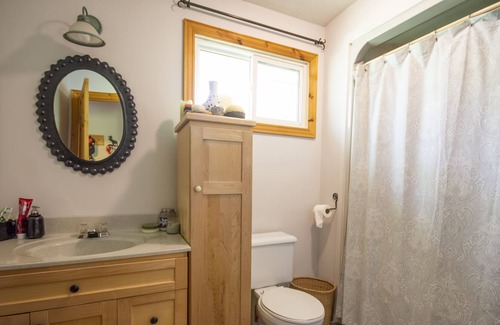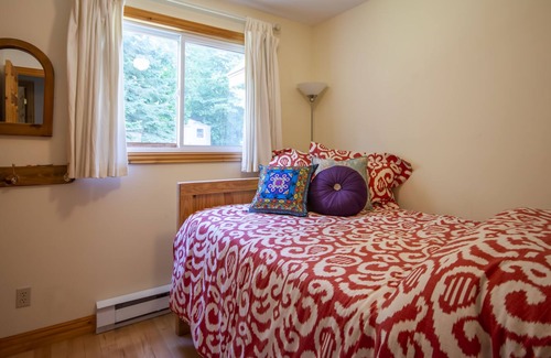 The main floor consists of an open concept kitchen, a living area, three bedrooms, a wood-burning fireplace, and one bathroom. The kitchen is fully stocked with ample place settings, utensils, basic spices, oils, and cookware. There is a coffee-maker (ground coffee is provided) and toaster oven. The tap water is UV-filtered and drinkable!