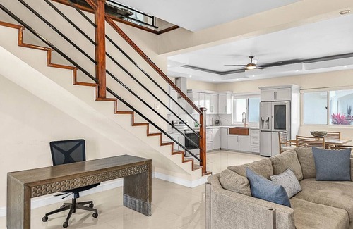 This bright, airy two-bedroom suite offers a spacious king and queen bedroom with ensuite bathrooms upstairs, separated by a bar lounge area with a Smart TV. Downstairs features a powder room, modern open-concept entertainment loft area, and fully equipped kitchen downstairs. Enjoy your Jamaican cuisine breakfast as you overlook the Caribbean Sea, or watch the lights illuminate the pool in the evening with a glass of wine and an enchanting atmosphere. With partial and full views of the Caribbean Sea, this suite provides pure elegance and stunning sunsets. This suite is perfect for four adults or two adults and two children.