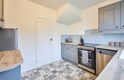 With light coloured walls and sky-blue tiles, the kitchen has a bright and airy feel. Grey wooden cabinets and modern fittings fit perfectly with the nature of the property. Fully equipped for all self-catering staycations, you’ll have access to an oven, hob, toaster, kettle, fridge freezer and dishwasher during your stay.