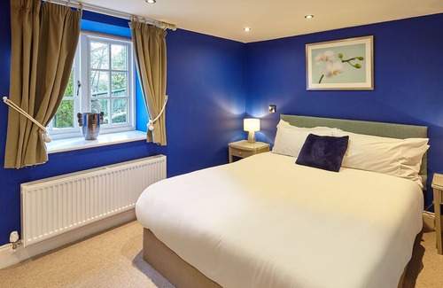 On the ground floor is where you will find the first bedroom. Containing a double bed, made up with the fine bed linens. Bedside tables and reading lamps sit alongside the bed. The room is painted a deep, royal blue meant to sooth you into the perfect night’s sleep. There is also a bathroom on the ground floor with both a shower and bath.