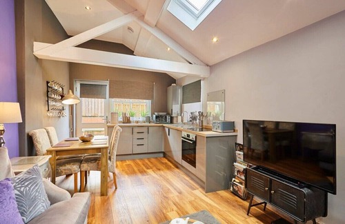 Majestic Purple has a stylish living area with a flat screen TV, comfy sofa and an armchair making it the ideal place to unwind with your loved ones. Varnished wooden flooring and a statement purple feature wall make this a really cosy place to relax.
