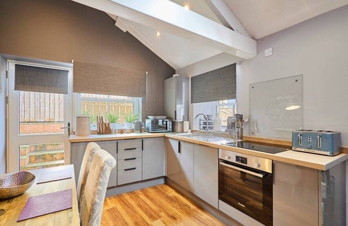 The apartment has a spacious kitchen diner which is situated towards the rear of the living space. Fully equipped for self-catering stays, the kitchen has modern appliances and cookware. The dining area includes a dining table with four chairs.