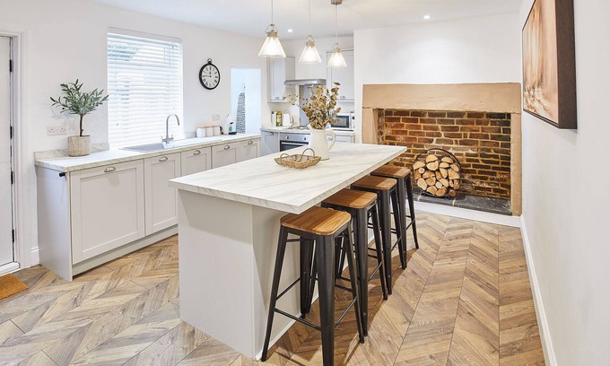 The kitchen is a modern space within this traditional property. It has all the appliances you need for a self-catering stay, as well as an inglenook fireplace, a breakfast bar dining area, and a wonderful bright appearance that makes you feel right at home.