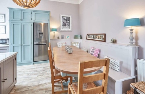 Fully equipped with modern appliances and cookware, the kitchen diner has everything you could need to make the most of your self-catering stay. Beautifully styled, the shaker kitchen is dove grey in colour and there is a large dining table with dining chairs and a built-in bench.
