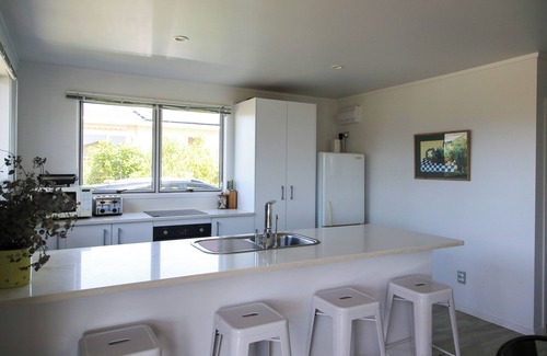 The lounge, kitchen, and dining are lovely, bright, welcoming spaces. The lounge has comfortable seating and a flat-screen TV, and the dining table has room for 6 with 4 stools at the kitchen bench. The kitchen is modern and well-equipped with everything you would need for your stay. There is a washing machine and a dryer available for guests, and there is a great area for car and boat parking. There is also a large back garden with a trampoline. After a day at the beach, the outdoor shower is great for cleaning off the sand and cooling you down. The best feature of this property, though, has to be the deck area. There is plenty of space to sit and eat your meals under the shade sail, and there is a comfortable lounge area that has a great view of the water and out to The Alderman Islands. It's a fantastic place to laze around and read a book or enjoy an afternoon snack and a cold drink. If you have small children, the bach is very handy for the playground and so is the beach!
