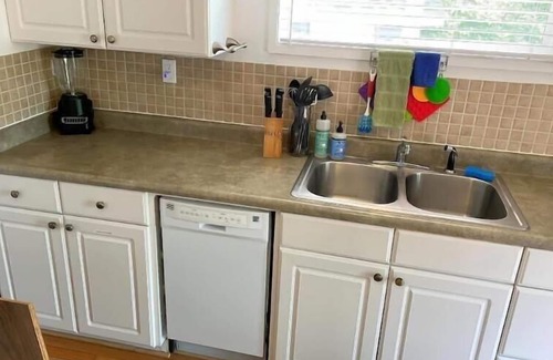 Relax in front of the fireplace in the cozy living room or enjoy the afternoon sun out on the large deck with a swinging chair for two. You'll also find a picnic table in the yard. The kitchen has a full size washer & dryer, an electric range with glass cooktop, full size refrigerator, apartment size dishwasher, and all the dishes and flatware you'll need.