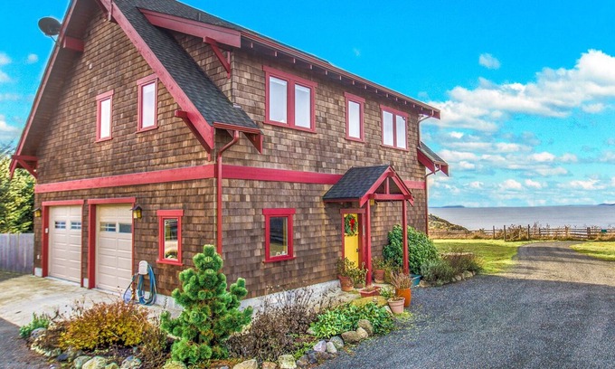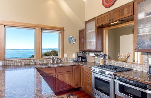 Water View Place -Hot Tub! This cozy and contemporary southwest-facing home offers a stunning view of Haro Strait and the Olympic Mountains. Spectacular water views make it ideal for seasonal whale watching. High vaulted ceilings expand this multi- bedroom home. The modern kitchen is well-stocked to make meal planning a breeze and offer a fantastic view while doing so. Guests can eat at the breakfast bar or enjoy the adjacent dining table seated by the southwest facing windows.