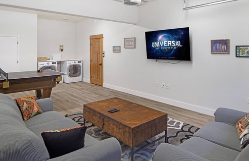 There is a bathroom on each floor conveniently located by the bedrooms. Upstairs you will find 2 bedrooms on either side of the full bathroom: the primary bedroom to your right with a private deck, and the Queen guest bedroom to the left. Downstairs you will find the 3/4 bathroom down the hall from the additional room equipped with a Queen bed. The downstairs of this home also boasts a newly remodeled game room! A pool table and ping pong table (can be converted) and a foosball table are supplied for guest-use! A gas fireplace and wood floors add to the warmth of this home making it perfect for all seasons.