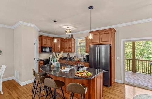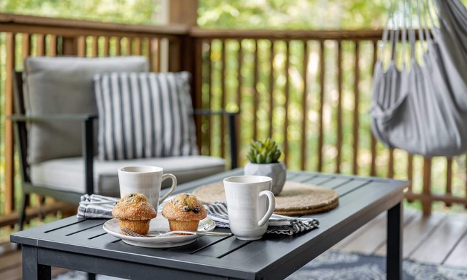 Our favorite feature about this house is the high spacious deck overlooking the trees in the back. With an almost treehouse feel, you will enjoy sipping your evening away under the ambience of string lights or relaxing in the cool mornings in the comfortable furniture. Fire up the grill and enjoy either dining out on the deck table or inside around the large family dining table.