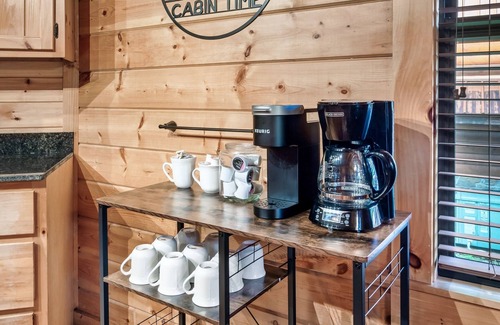 The cabin has a bedroom on the first floor which features a king bed and Smart TV. The main bedroom is on the upper floor with a king-size bed plus a jacuzzi tub right in the bedroom. There’s also an en-suite shower room with water closet and double sinks. Both bedrooms have plenty of storage space in the closets and dresser drawers.