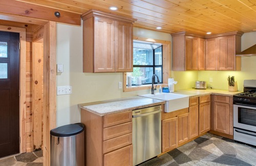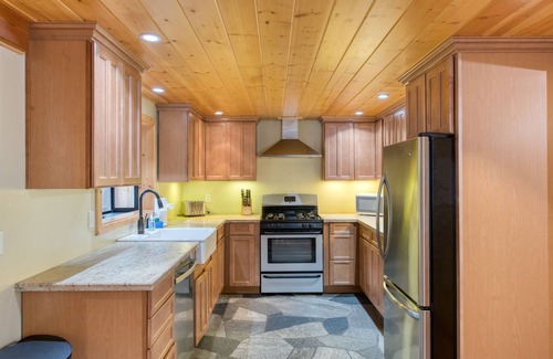Inside, Sugar Point boasts a cozy main living room with a comfortable leather sofa, TV, and charming stone fireplace. You’ll also find a dining area sitting under skylights as well as a recently-renovated, fully-equipped kitchen with everything you need to prepare at-home meals and snacks. And if you’re in the mood for dining out, Tahoe City is just a short drive away with plenty of dining and entertainment options.