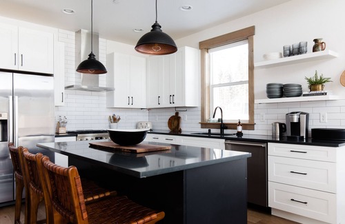 Escape the winter blues and replenish at this incredibly sunny cabin, featuring floor to ceiling east facing windows overlooking a serene tree-lined meadow. Watch the sunrise with a morning cup of coffee from the living room or hot tub, and you may even spot elk grazing in the meadow. 6 adirondack chairs encircle the warm gas fire pit outside ready for stargazing. Inside the living room you'll find seating for 6 on two comfy sofas, plus 2 chairs anchored by a cozy gas fireplace. The dining table seats 8 comfortably plus 3 bar seats at the quartz island.