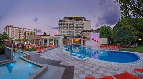 Hotel Eliseo in Montegrotto Terme features a modern wellness center with therapeutic thermal pools. All rooms boast a private balcony with views of the large garden, and parking is free. Hotel Eliseo Terme includes indoor and outdoor pools, both at 35° C, and open daily from 08:00 until 23:00. Hot tub, sauna and water aerobics courses are also available. Rooms are elegant and offer a satellite flat-screen TV, and a small fridge. Each has a private bathroom with soft bathrobes and slippers. The Eliseo's restaurant overlooks the park, and in summer meals are served on the terrace. Breakfast is an American buffet. The hotel is set on the main shopping street of Montegrotto. The bus to Padua stops just outside the door.
