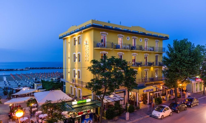 Hotel Estate is right on the seafront in Rimini's Torre Pedrera area and faces its private beach. You can relax in the outdoor swimming pool and the wellness area with sauna and hot tub on the top floor. Rooms have bright color schemes and different furnishings. Each one is air conditioned and includes free Wi-Fi and a view of the promenade or sea. A sweet Italian or continental breakfast is served each morning. The restaurant on the ground floor is open from mid May until mid September and overlooks the sea. The Estate Hotel is a family-run property that provides a paid shuttle to its car park 1969 feet away. You can rent parasols and deckchairs at the beach. You can treat yourself to a massage or take advantage of the transfer to the beach and nearby towns. Rimini center is 10 minutes' drive away, while the Italia in Miniatura theme park is 1.9 mi away.