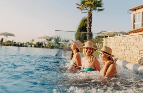 Featuring a 23 ft² wellness and spa area with a panorama relaxation area and an in-house thermal spa, the 4-star superior Hotel & Spa Larimar is located in Stegersbach in Southern Burgenland. Access to the Larimar Thermal Spa with 9 pools, 9 saunas and 9 relaxation areas (incl. Ladies Spa), is included in all rates. The modern rooms with a panoramic view and on the west side offer restful and healthy sleep. They are elegantly furnished and come with a balcony or terrace. A bathrobe, a bath towel and slippers are provided in every room. Guests are welcomed with a glass of sparkling wine. The spa area of the Larimar offers water in 3 different qualities, from thermal water to sea water and fresh water. There are 9 different saunas, an infrared-salt grotto with himalaya salt stones, a salt steam bath, an infrared sauna, a luxurious panorama relaxation room, a tea and fruit bar, and a modern fitness center. A daily wellness and activity program is included, and bicycles, Nordic walking sticks and Smovey rings are provided free of charge. Children from 16 years of age and older can access the sauna area (nude area). Guests can enjoy healthy gourmet cuisine at Hotel Larimar. Full board includes a healthy breakfast buffet with many organic products, a lunch snack with soups and salads, raw fruit, pastries in the afternoon, and a 6-course dinner. Regional and seasonal products are used for most dishes. The Larimar Bar offers cocktails and various other drinks. Every Thursday, an exquisite gourmet evening is organized, while on Thursdays and Saturdays live music is offered. Golfschaukel Stegersbach Lafnitztal is next to the hotel. It features 45-holes on 3 different courses. Guests receive a room for storage of golf equipment, cleaning facilities for golf clubs and golf shoes and golf carts (rental prices on request).