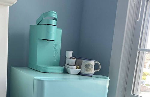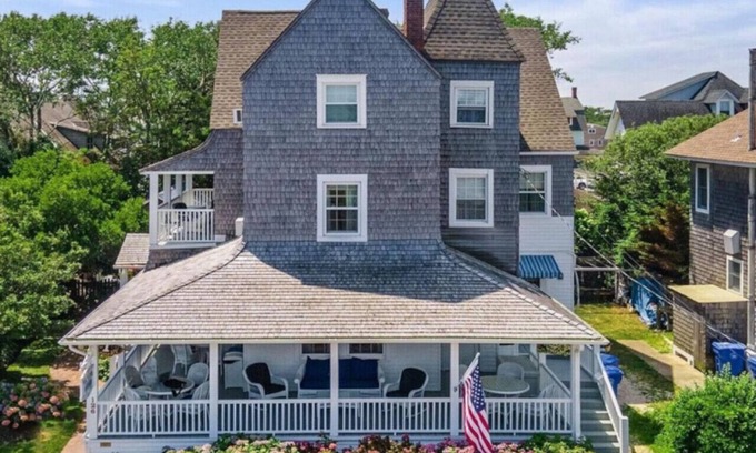 330 feet from the beach, The Beach Club Victorian is a boutique guesthouse with 10 cheerful rooms around a saltwater pool. Each includes a private bath, mini fridge, Keurig, AC, WiFi, and new furniture. Suite B features a king bed and 2 XL twin beds in separate rooms, full bath, and seating area on the second floor. Includes beach badges, towels, linens, soap, paper towels, pods, hairdryer, iron, and bikes (on request). No toiletries, beach gear, laundry, or daily cleaning
