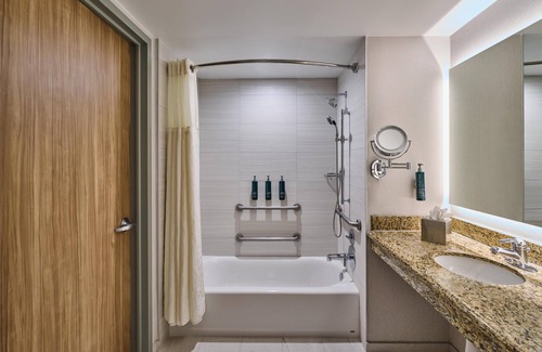 Hotel Zessa Orange County Airport, a DoubleTree by Hilton offers 254 accommodations with laptop-compatible safes and coffee/tea makers. Beds feature down comforters and premium bedding. Televisions come with premium cable channels. Bathrooms include shower/tub combinations, designer toiletries, complimentary toiletries, and hair dryers.