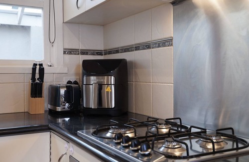 The kitchen has all the mod cons you would expect as well as an air fryer for your use. There is plenty of pantry space and counter space for your use during your stay. Off the kitchen you will find the enclosed outdoor area.
