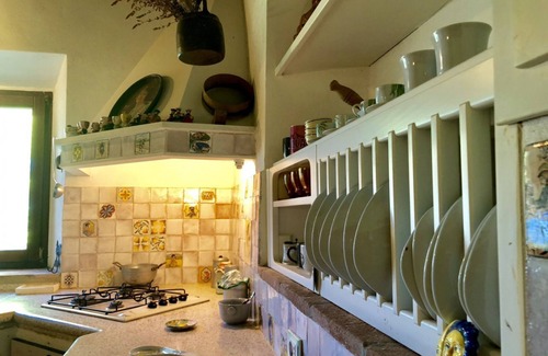 living room with a confortable sofa bed. Also here every single corner has been studied and detailed by the artist: the terracotta tiled floor, the ceramic tiles hand painted by the artist with clearly medieval and renaissence inspiration, hand painted plates and vases and old tools used in the field work make an exquisite decoration inside this beautiful apartment.