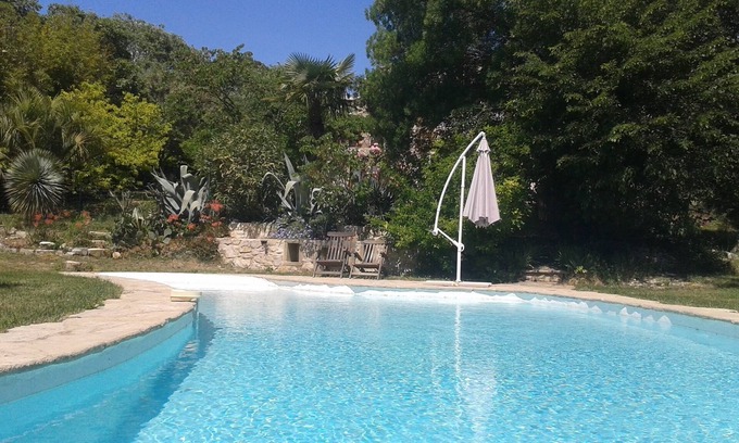 Two other bedrooms with double beds, shower room and wc are located below the house, on the same level as the garden with palm trees, Judas tree, cherry, ash, bamboo. A rock garden overlooking the infinity pool, all in curve, accessible by a gentle slope (ideal for young children), overlooks a vast meadow where children can play freely. Table tennis, deckchairs and parasols, barbecue, parking (3/4 cars), night petanque ground with fridge. Swimming pool with pleasant progressive access for children.