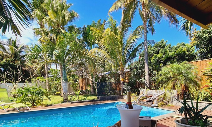 Located in Saint-André, Villa Est’time presents the authentic charm of the East of the island. Five minutes from the main roads and all amenities. On one level, resolutely turned towards a lush tropical garden without vis-à-vis, it offers a large veranda open to the salt pool area and secure. Conviviality guaranteed around the bar and the outdoor kitchen!