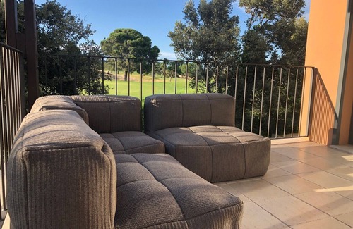 Apartment 2 rooms, 1 suite with its own bathroom and solarium, 1 bedroom with two double beds with possibility of extra bed, fully equipped kitchen with all luxury appliances, spectacular views of the 1st line of green, views of the Mediterranean Sea, 1st line of swimming pool, apartment with own high speed wifi and digital cable television.