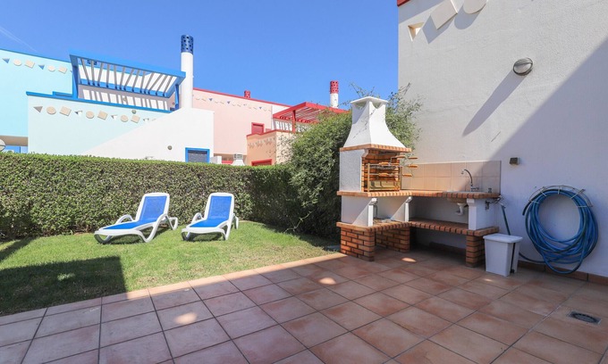 3 bedroom villa in private condominium with swimming pool and parking, 10 minutes' walk from Manta Rota beach.Property comprises 2 floors: - Ground floor: living/dining room, fitted kitchen, bathroom with shower and 1 bedroom with 1 double bed. It has access to a patio with garden, which surrounds the house on one side, with a table and chairs, barbecue, sink and sun umbrella, perfect for enjoying family meals outdoors. - 1st floor: 2 bedrooms, one with a double bed (en suite) and the second with 2 single beds. There are 2 bathrooms, one with a bath and the other with a shower. You have access to 2 impressive terraces, facing south and north. The kitchen is equipped with: fridge freezer, hob, oven, microwave, toaster, filter coffee machine, dishwasher and washing machine. There are 2 parking spaces inside the condominium gates, one of which is covered, and access to a communal swimming pool.Access to WI-FI (internet) + MEO TV and equipped with air conditioning.The villa is located about 650 metres from Manta Rota beach, with various amenities within walking distance, including cafés, restaurants, supermarkets, ATMs and more.Book your holiday now!