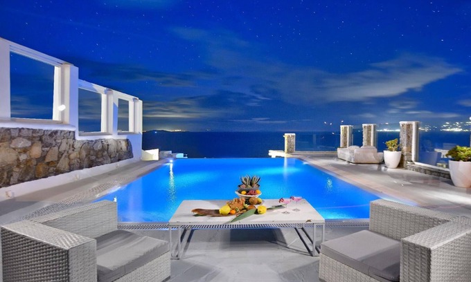 The property is located in one of the most distinct areas of the island with uninterrupted views of the Aegean Sea and the Cycladic Islands of Delos, Syros, Tinos with 180 degrees views having a large infinity edged swimming pool.