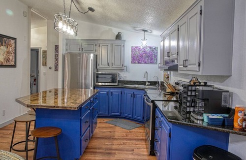 3 bedroom house in the mountains of Colorado. Bring your kayaks, paddleboards or boat and enjoy the 1100 acre lake. It has a fully fenced in backyard with a deck and patio furniture to enjoy dinner outdoors. In addition to all of the bedrooms on one floor, there is also the spacious kitchen, comfortable living room with a comfortable sectional & a large screen TV, dining room for 6, and a laundry room. Guests have access to the entire home, front and backyard. The kitchen is fully stocked and the home comes with linen, towels, and toiletries.