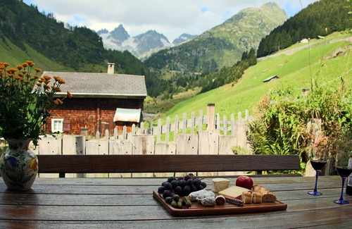 From the well-equipped kitchen of the main entrance goes beyond the seat. From there, man has a great view of the mountains with the Fünffingerstöcke.