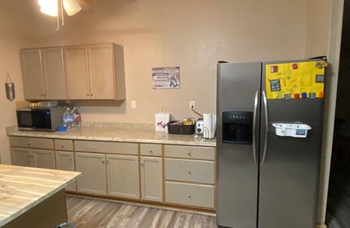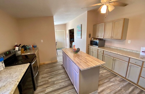 3 bdr, 2 bath house. Sits on a half acre of a full acre property. 20 x 20 addition living room which is the front entrance and also connects to a door to walk out on the covered porch and a fenced front yard. There is 2 sleeper sofa’s and 2 recliners. Entering the main house is another living room, a big open kitchen with an island and a dining area. Off the kitchen is the coffee bar which has a side door entrance and exit to the playground, firepit, and swimming pool area. Bedroom 1 is the master and has a king bed and en-suite bathroom with a garden tub and a 5ft walk-in shower. 2nd bedroom has 2 full beds. 3rd bedroom has a full bed and twin bunk bed. All rooms have TVs. Included is a laundry shed with 2 washers and 2 dryers. The outdoor space is shared with my other half-acre and has 3 rental cabins. This listing is for the house and outdoor pool/playground area only. This house will be listed as a whole property with 3 cabins/house together.