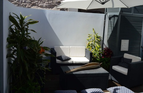 Downstairs is the dining room and living room, a service bathroom, a fully equipped kitchen and access to a very cozy patio with garden chairs.