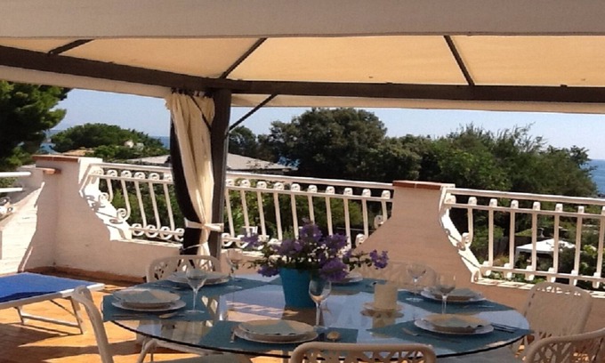 mmersed in the green, in quiet, panoramic terrace overlooking the sea with a gazebo for outdoor dining, outdoor shower in the garden pool, air conditioning, maximum 8 beds, all mod cons, possibility of cleanings.