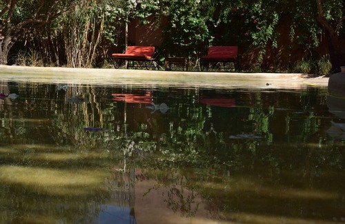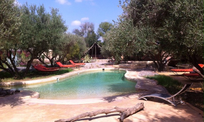 (Text automatically translated) SPA, swimming pool (heated 28 °) in the heart of the olive grove in the garden background. Natural forms, sober colors, entered the water gently sloping ... all combine to relax and rest. The garden to the image of the site; sixties olive trees, orange trees, palms and citrus trees, invites to relaxation and relaxation.The top of the terrace, beautiful view of the snowy Atlas Mountains. Guests are invited to relax in the sun, surrounded by a few shrubs whose flowers citrus perfume the air with their sweet fragrance.