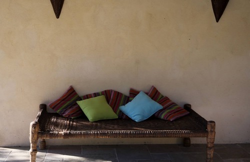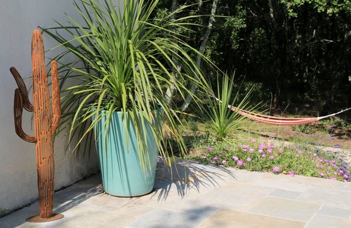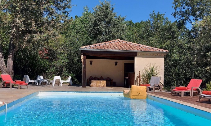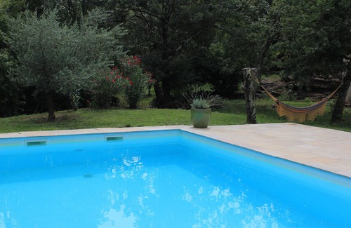 (Text automatically translated) house with swimming pool located in a quiet, not overlooked on wooded land not fenced compound oaks, olive trees and rocks. Safe Pool (tarpaulin approved safety) with summer kitchen and shower. Large shaded terrace.