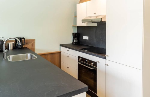 This modern holiday home is located in a small-scale holiday park, in the middle of the forest. Due to the shape of the partly thatched roof, this accommodation has a special appearance, both outside and inside. The holiday home is suitable for up to four adults and two children and features three bedrooms. One of the bedrooms has a bunk bed (for children). The living room with open plan kitchen features a comfortable sitting area and a spacious dining table. Perfect to spend some quality time together. On nice days, you can open the French doors and also enjoy the terrace with garden furniture. At this holiday park, you can also book other accommodations for various groups and in various locations.