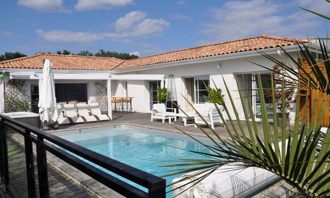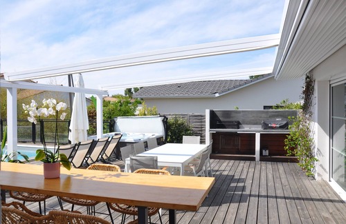 Equipped kitchen open to living room of approximately 50 m² itself opening onto a 130 m² wooden terrace, shaded by a awning, a 8x4m heated swimming pool secured by electric shutters, traditional sauna (4 places) and a jacuzzi ( 6 places).