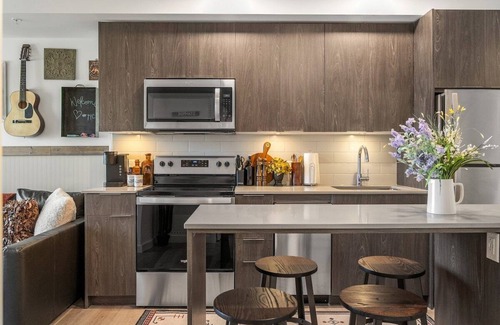 As you enter our brand NEW condo, you'll be transported to the era of cowboys and outlaws with our carefully curated Western decor. The spacious living area features decor, a fully equipped kitchen with modern amenities, and a kitchen island that doubles as a space for meals.