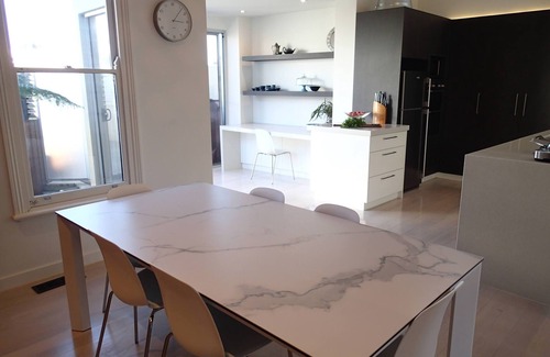 Howe's This! Located on Howe Crescent, this dress circle, inner Melbourne, bayside townhouse, overlooking a park, has a classic exterior and modern interior featuring collected artwork. Three large bedrooms. Stylish ensuite and bathroom. Spacious living and dining rooms. Modern kitchen with European appliances. Executive Study with sofa bed. Equipped wellness studio. Upper terrace with BBQ for al fresco dining. A/C, WiFi, Netflix. Parking out front. Near shops and transport. It’s first class.